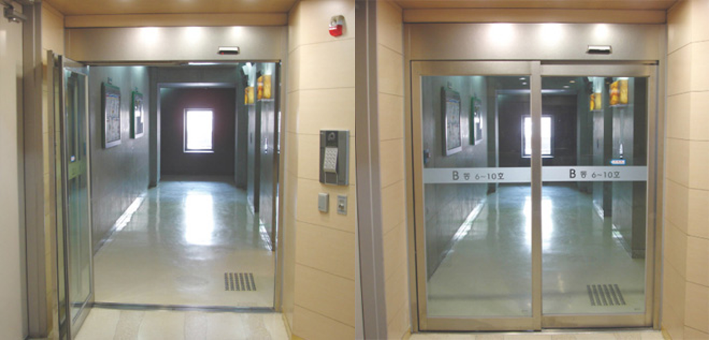 | 패닉자동문이 설치된 곳에서 이삿짐을 옮길때나 대형빌딩이나 아파트, 호텔, 병원 등에서 화재가 발생한 경우 또는 비상탈출이 필요한 경우에 내부에서 밖으로 탈출할 때 자동도어가 열린상태에서 힘차게 밖으로 밀면 수동도어와 자동도어가 밖으로 열림과 동시에 기존크기보다 두배로 출구가 확보되어 화물이나 많은 인원이 한꺼번에 탈출할 수 있는 제품입니다. 기존의 패닉자동문 도어보다 내구성이나 편리성을 보완하였고 FIX 강화유리의 적용 폭을 다양하게 선택할 수 있습니다. 현재 미래자동문의 패닉자동문 도어는 특허청에 특허출원 중입니다. |